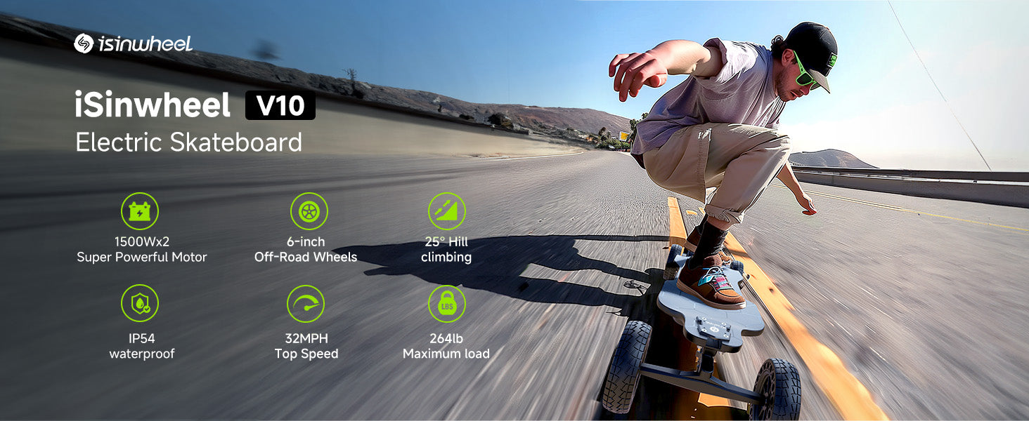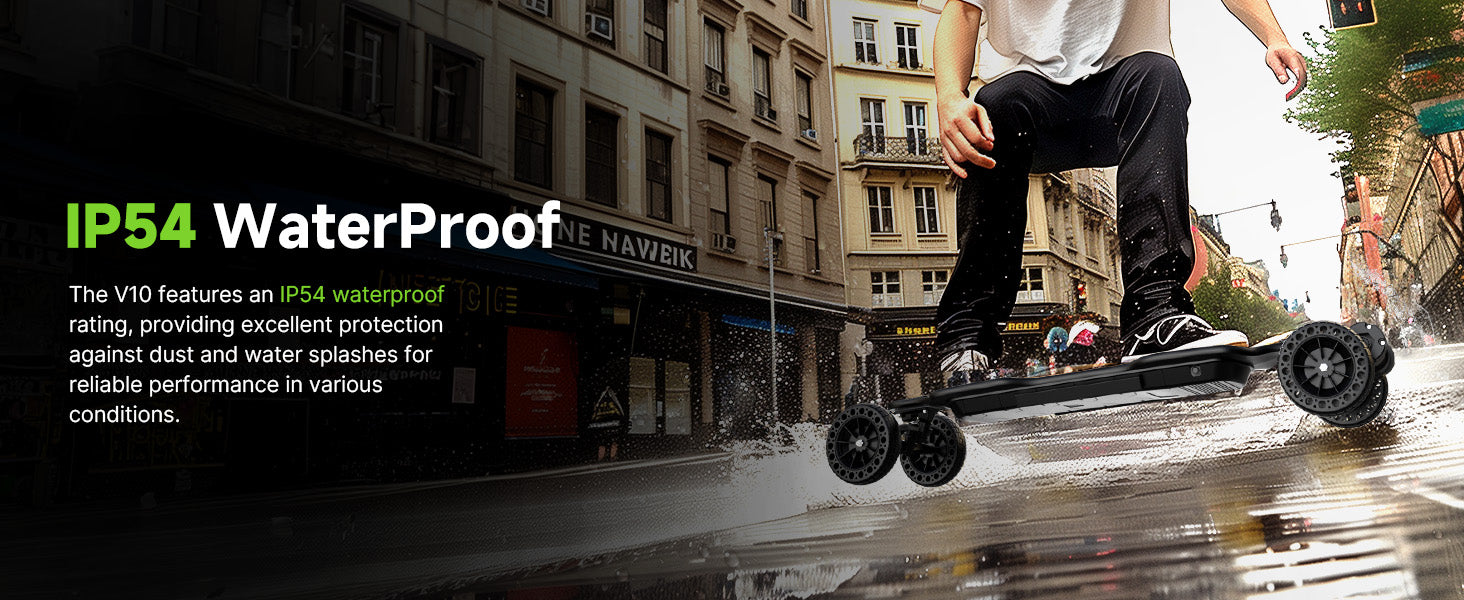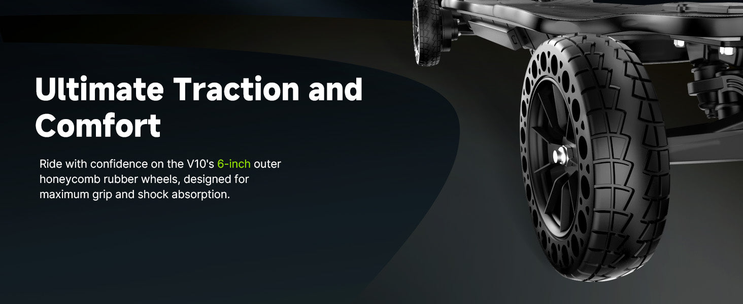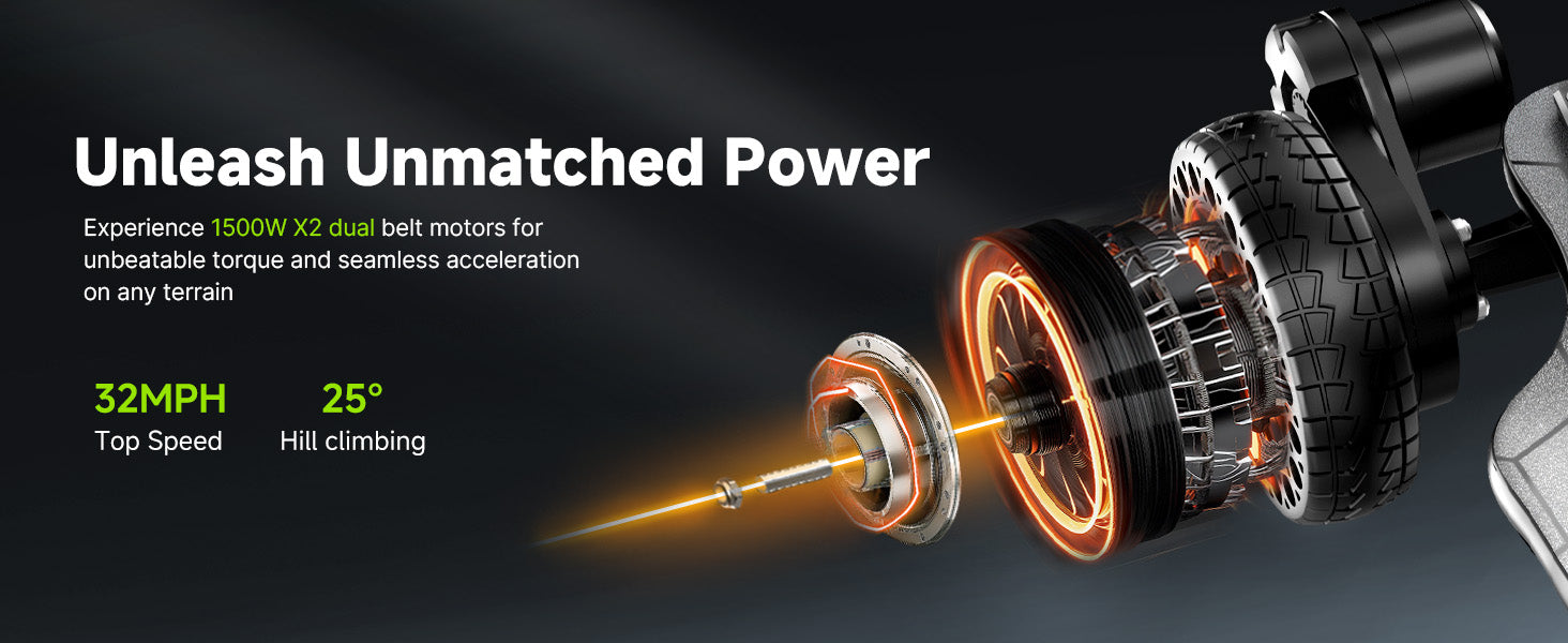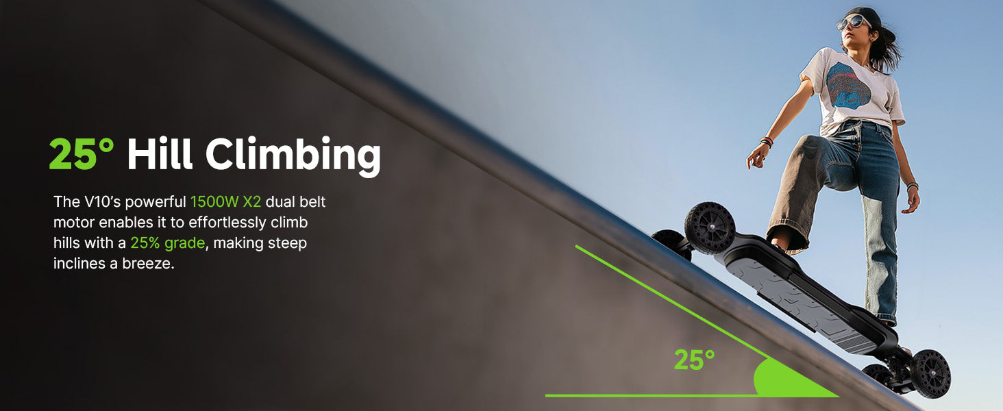 The V10 features dual 1500W belt motors (3000W total), giving you instant acceleration and strong hill-climbing up to 25° slopes — ideal for off-road and steep routes.