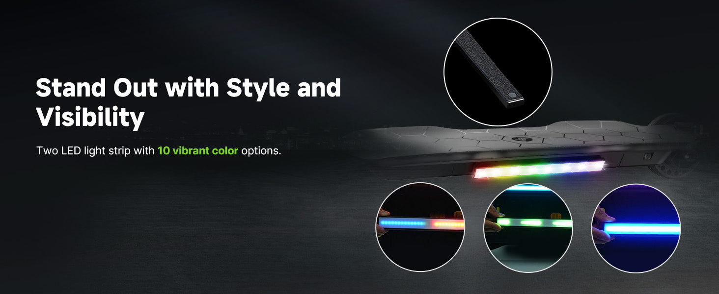 Yes. The dual LED light strips with 10 color modes improve night visibility and safety while giving your board a stylish glow.