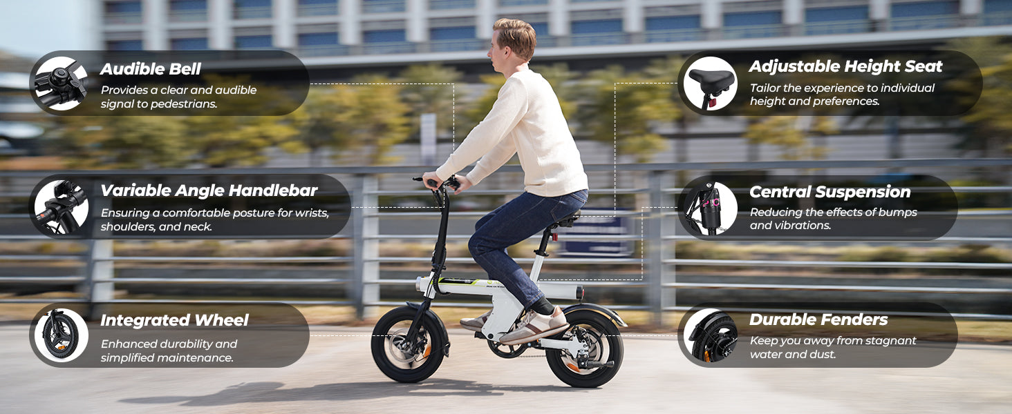 It comes with an intelligent display (showing speed, battery level, assist level, distance, etc.), durable fenders (keeping you away from water and dust), and an audible bell (alerting pedestrians clearly).