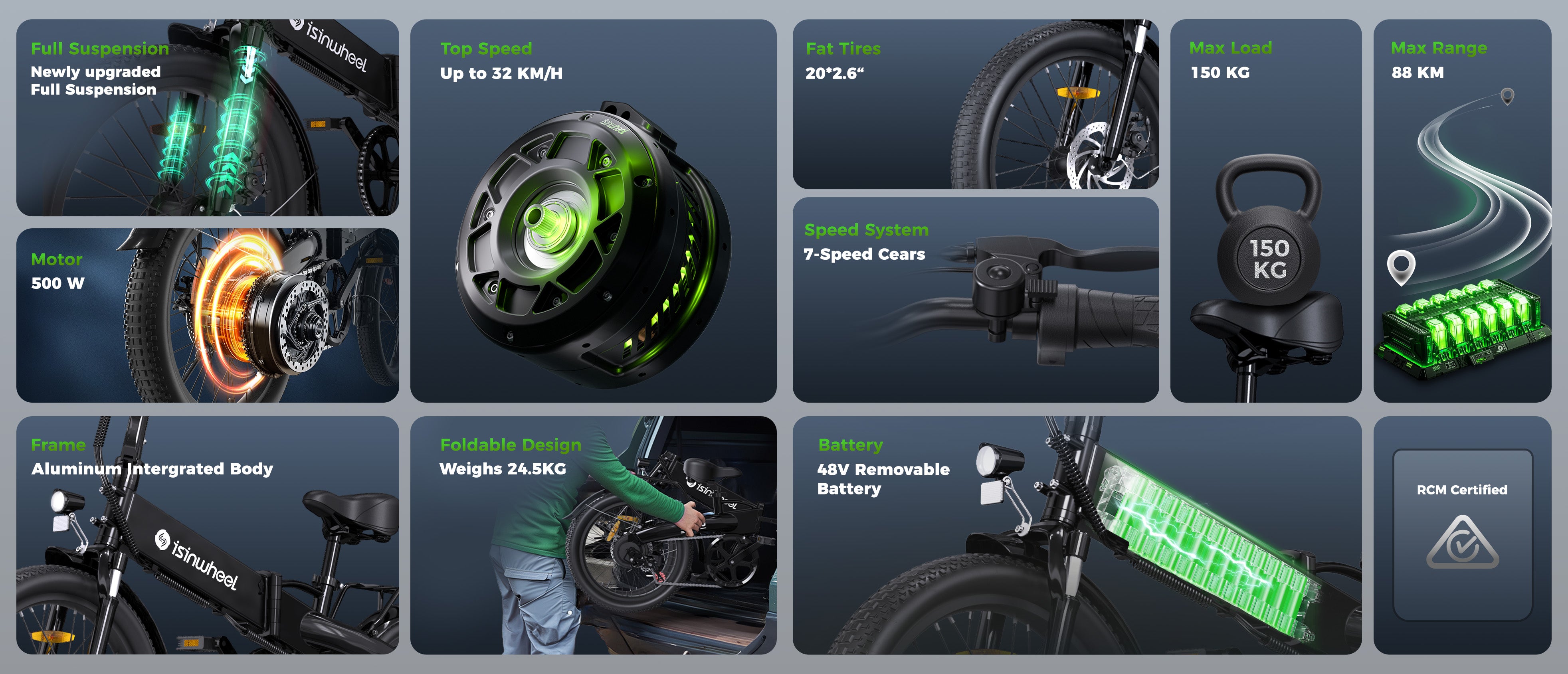 ✅Rated 250W (Max 500W) Motor, Max Speed 32 KM/H.